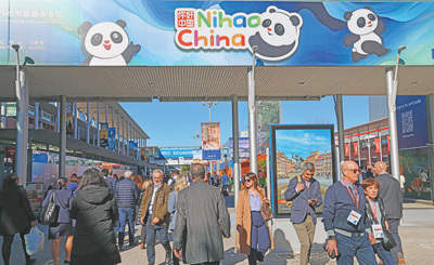會展中心外側主通道的顯著位置,印有“你好!中國”國家旅游形象圖案的廣告牌。本報記者 許海林攝