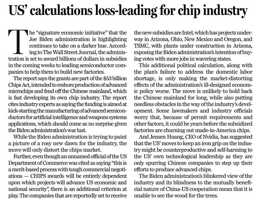 美國失策的經(jīng)濟(jì)政策本已造成市場扭曲,疊加出于政治意圖的算計(jì),以及補(bǔ)貼也無法解決的勞動(dòng)力短缺問題,這一切只會(huì)讓扭曲態(tài)勢進(jìn)一步惡化。此舉不太可能長期遏制中國大陸,但卻給行業(yè)發(fā)展帶來種種不必要的障礙。美國部分國會(huì)議員及企業(yè)高管擔(dān)心,受到許可要求及其他因素影響,享受補(bǔ)貼的企業(yè)可能要花費(fèi)很多年才能生產(chǎn)出美國制造的芯片。