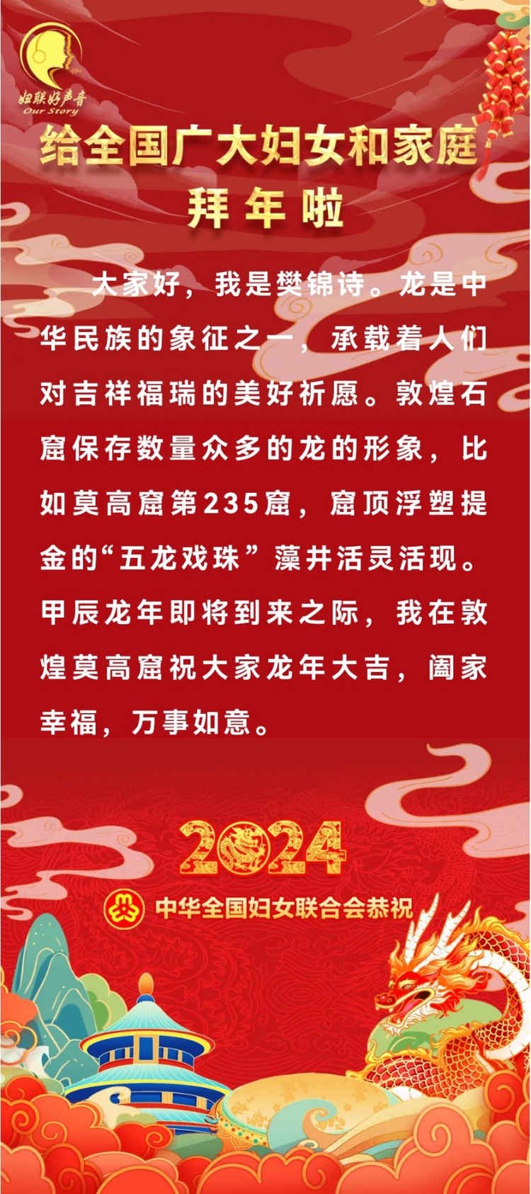 為深入學(xué)習(xí)貫徹習(xí)近平總書記同全國婦聯(lián)新一屆領(lǐng)導(dǎo)班子成員集體談話時(shí)的重要講話精神,進(jìn)一步激揚(yáng)巾幗之志,匯聚巾幗之力,積極投身強(qiáng)國建設(shè)、民族復(fù)興的偉大實(shí)踐,值此甲辰龍年新春到來之際,全國婦聯(lián)推出“婦聯(lián)好聲音”系列活動(dòng),精心策劃制作了“弘揚(yáng)文明新風(fēng)尚 喜氣洋洋賀新春”新媒體產(chǎn)品,特邀全國優(yōu)秀女性代表向廣大婦女和家庭送來新春祝福,以此激勵(lì)新時(shí)代半邊天牢記總書記囑托,與黨同心同行,爭(zhēng)做時(shí)代的書寫人,追夢(mèng)的奮斗者。