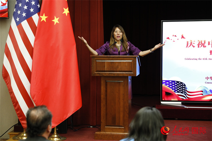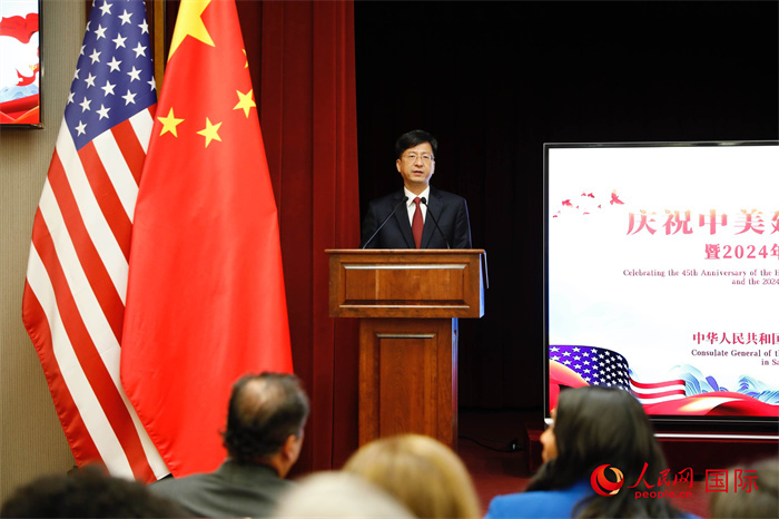 | 中國(guó)駐舊金山總領(lǐng)事張建敏在招待會(huì)上致辭。人民網(wǎng)記者 鄧圩攝 |