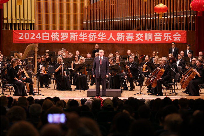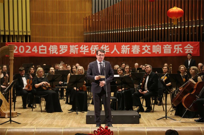 格羅馬達(dá)第一副部長在致辭中首先向在場的中國朋友以及全體中國人民致以美好的新春祝福并表示,盡管白俄羅斯與中國相隔萬里,兩國仍建立了緊密且高效的協(xié)作關(guān)系。中白文化領(lǐng)域合作是兩國關(guān)系中重要的組成部分?!皻g樂春節(jié)”框架下的大規(guī)模慶?;顒右讯嗄暝诎着e辦并成為良好傳統(tǒng)。包括今晚的華僑華人交響音樂會在內(nèi)的慶祝中國春節(jié)的活動讓白民眾更好地了解中國及其節(jié)日文化,使兩國民眾的距離更為親近。談到中國,總是令人想起古老又富有教育意義的璀璨歷史。中國享譽世界的眾多名勝古跡蘊含著中國人民驚人的創(chuàng)造力和深邃的中國智慧。2024年是中國龍年,也是白俄羅斯“質(zhì)量年”。相信在這一特殊年份,雙方將更加積極地實施植根于兩國優(yōu)秀傳統(tǒng)價值觀的聯(lián)合文化創(chuàng)意項目。祝中國朋友新的一年里身體健康、諸事順?biāo)?、國泰民安、春?jié)快樂。