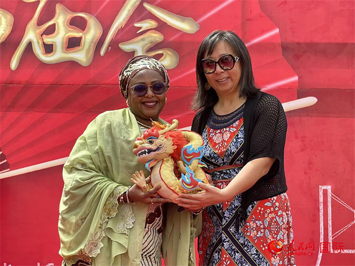 中國駐尼日利亞大使夫人梁慧麗(右)向尼日利亞聯(lián)邦藝術(shù)、文化和創(chuàng)意經(jīng)濟部常任秘書代表艾伊莎(左)贈送龍年生肖禮物。人民網(wǎng)記者 姜宣攝