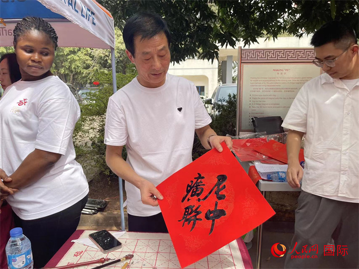 在中華文化展示區(qū),來賓們享受著“茶藝表演’“剪紙表演”的藝術(shù)熏陶。在觀看了書法表演后,一些尼方嘉賓躍躍欲試,寫下人生當中的第一個漢字,倍感喜悅。