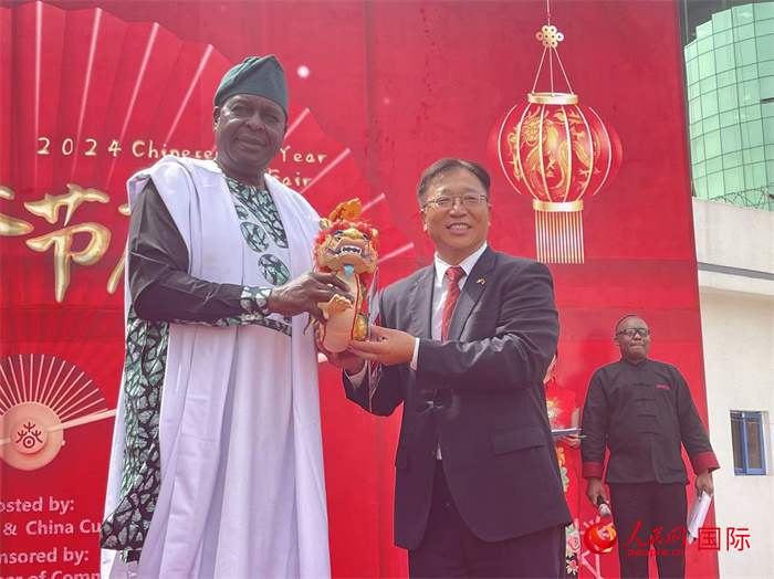 中國駐尼日利亞大使崔建春(中)向倫賽維(左)贈送龍年生肖禮物。人民網(wǎng)記者 姜宣攝