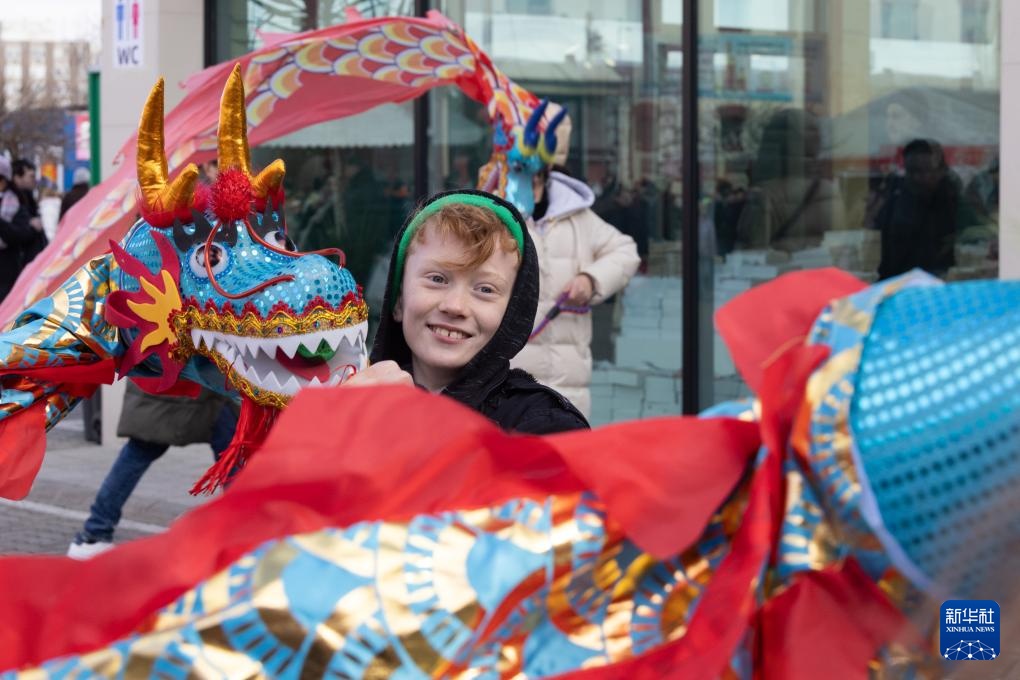 2月3日,在匈牙利布達(dá)佩斯唐人街新春廟會上,一名男孩體驗(yàn)舞龍。新華社發(fā)(弗爾季·奧蒂洛攝)