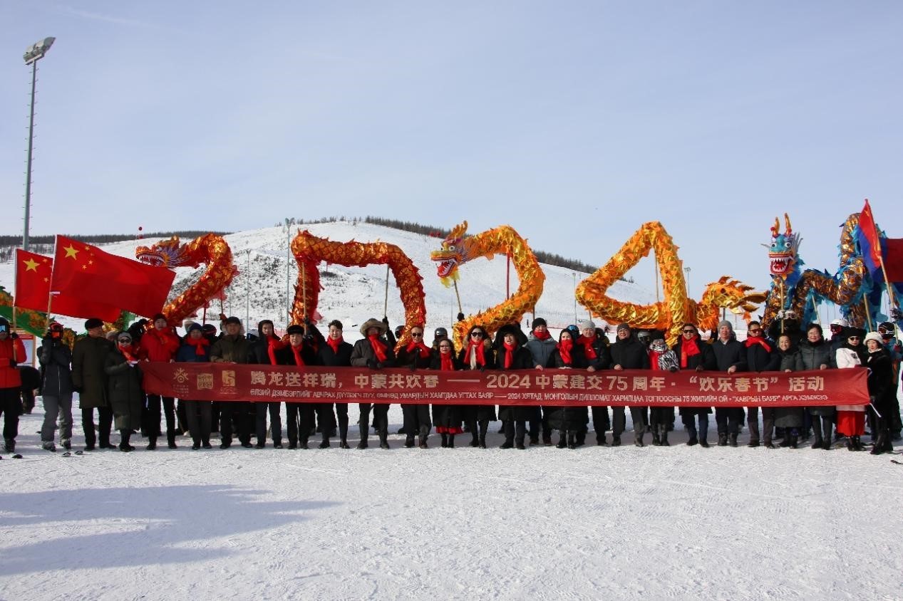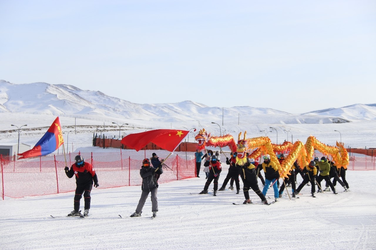 活動(dòng)首先在位于烏蘭巴托市區(qū)東南的滑雪場(chǎng)展開。35名蒙古國(guó)滑雪運(yùn)動(dòng)員在4面中蒙國(guó)旗的引領(lǐng)下,迎著凜冽的北風(fēng),從幾十米高的山頂,托舉綠色、紅色、銀色、金色、藍(lán)色5條巨龍分別從兩條雪道徐徐滑下,寓意龍瑞天降,拉開了慶祝中蒙建交75周年“歡樂春節(jié)”系列活動(dòng)的序幕。
