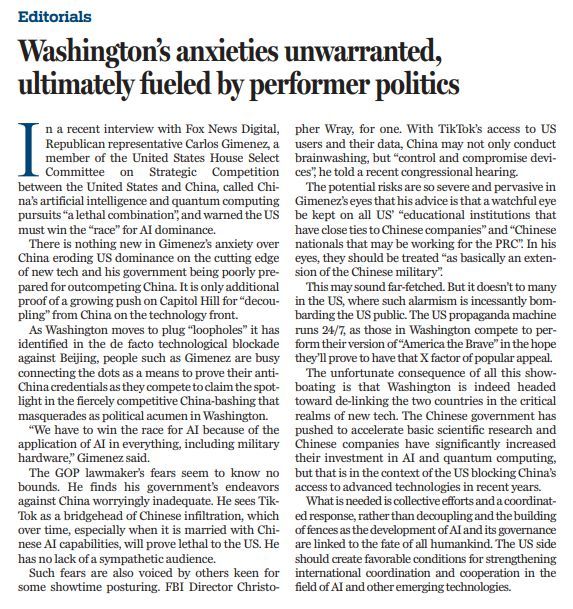 吉門尼斯擺出一副對(duì)中國科技迅速發(fā)展憂心忡忡的樣子,這在華盛頓并不新鮮,是國會(huì)山反華政客為一己之私推動(dòng)在科技脫鉤、破壞國際科技合作的又一例證。