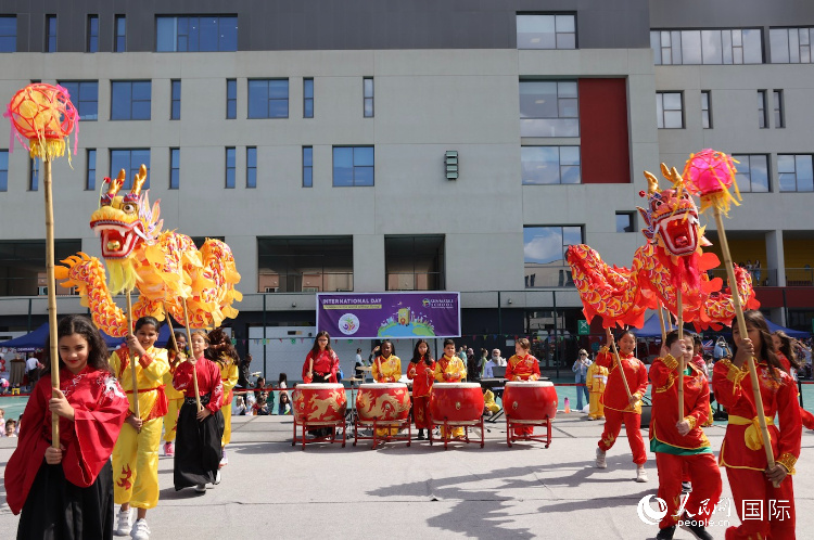 | 圖為迪拜尚瑪科國際學校學生展示舞龍表演。人民網(wǎng)記者 張志文攝 |