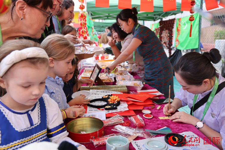 成立儀式上,由該校學生展示的舞龍表演贏得陣陣掌聲。而在一旁的中國文化展臺充滿“年味兒”,書法作品和小吃美食等備受各國師生家長青睞。