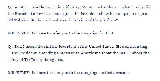 有記者問道,“為什么總統(tǒng)允許他的競選活動(dòng)在TikTok上進(jìn)行?”美國國家安全委員會(huì)發(fā)言人約翰·柯比建議他向拜登競選團(tuán)隊(duì)咨詢。