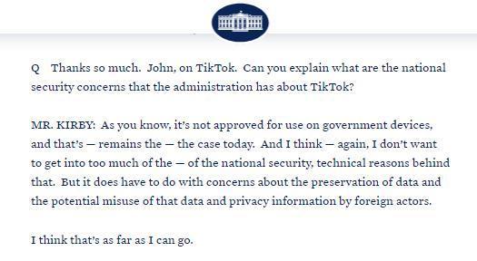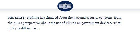 柯比表示,從國家安全委員會(huì)的角度來看,“對在政府設(shè)備上使用TikTok的國家安全擔(dān)憂沒有改變,這一政策仍然有效?!?/p>