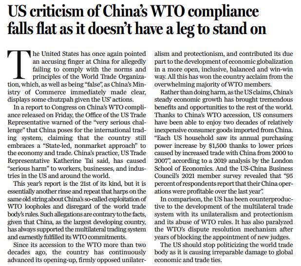 原標(biāo)題:US criticism of China's WTO compliance falls flat as it doesn't have a leg to stand on