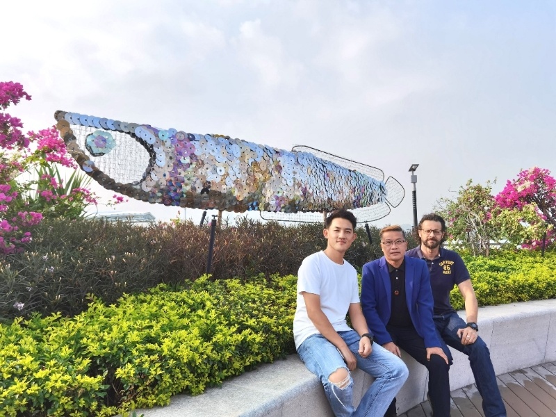 菲律賓藝術家波·安茲(左二)與友人在可回收垃圾制作的大型藝術裝置前。受訪者供圖