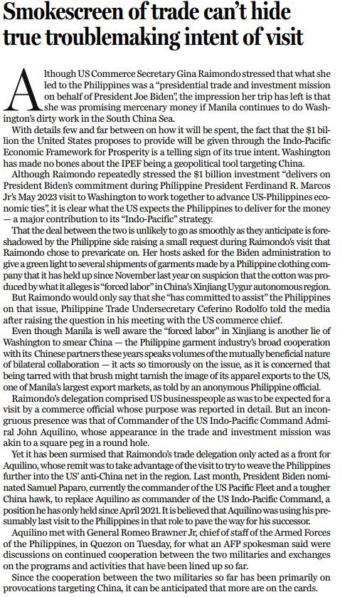 美國商務(wù)部長雷蒙多強調(diào),她訪問菲律賓所率領(lǐng)的是“代表總統(tǒng)拜登的貿(mào)易和投資代表團(tuán)”,但她此行給人留下的印象卻是,如果菲律賓政府繼續(xù)為美國在南海“做工作”,美國政府就承諾給菲律賓投資。