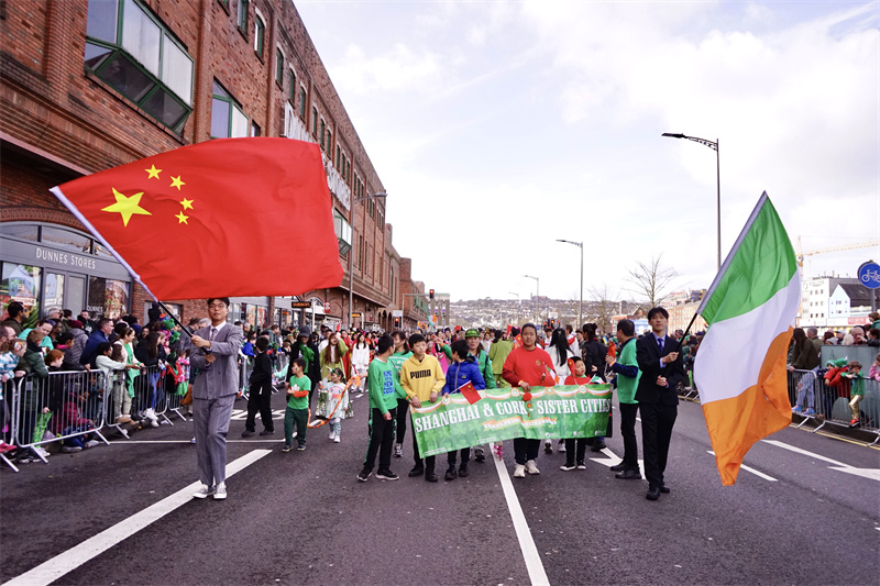 科克大學(xué)孔子學(xué)院組織的隊伍手持中愛兩國國旗,手拉科克與上海友好城市的橫幅??瓶舜髮W(xué)孔子學(xué)院供圖