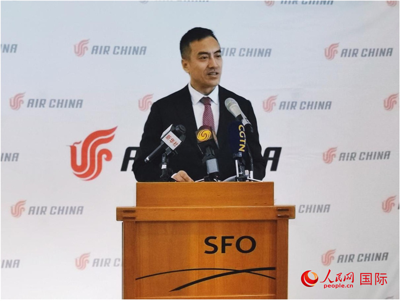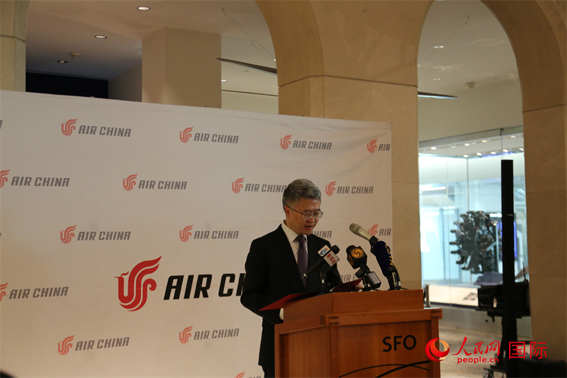 國航北美地區(qū)總部總經(jīng)理彭雷發(fā)表致辭。人民網(wǎng)記者 鄧圩攝