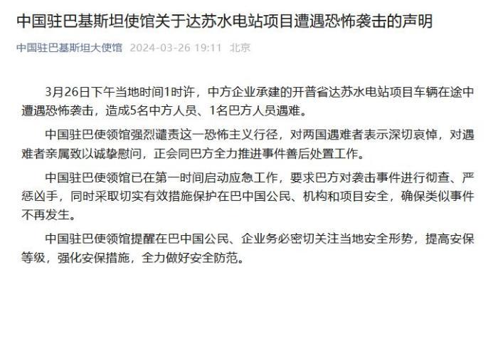 聲明表示,當(dāng)?shù)貢r間3月26日13時許,中方企業(yè)承建的開普省達蘇水電站項目車輛在途中遭遇恐怖襲擊,造成5名中方人員、1名巴方人員遇難。