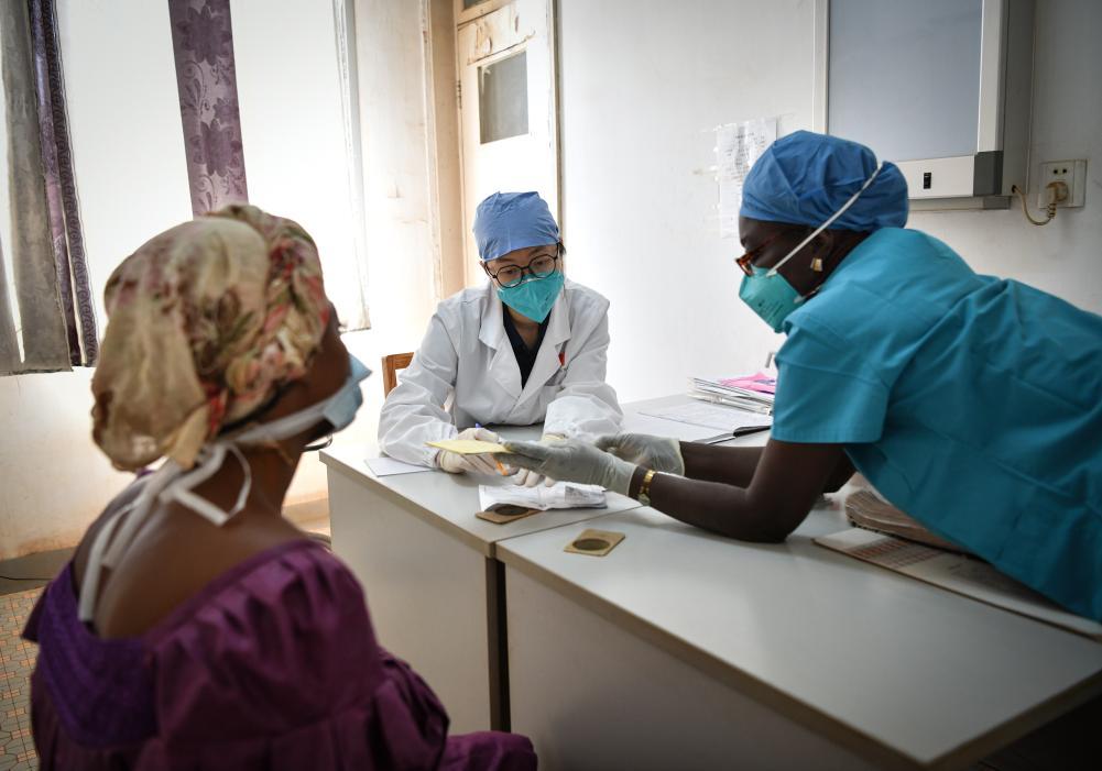 2024年2月5日,在中非共和國(guó)首都班吉,援中非中國(guó)醫(yī)療隊(duì)婦產(chǎn)科醫(yī)生梁丹(中)與助手(右)在班吉友誼醫(yī)院為患者診療。新華社記者韓旭攝