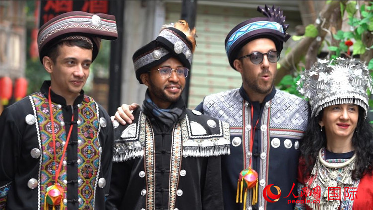 3月14日,外國記者們在廣西省柳州市融水苗族自治縣夢嗚苗寨體驗(yàn)民族服飾。人民網(wǎng) 周琳佳攝