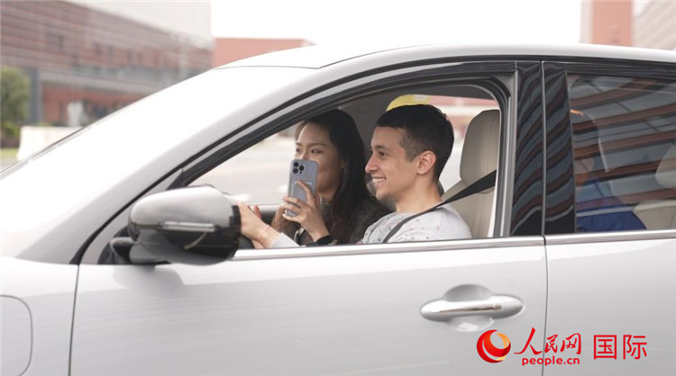 3月13日,外國記者在廣西省柳州市在上汽通用五菱寶駿基地試駕新能源汽車。人民網(wǎng) 蘇纓翔攝