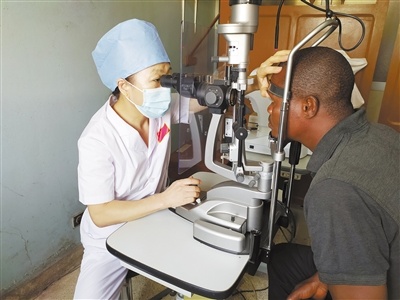 中國(guó)專家正在為貝寧當(dāng)?shù)鼗颊哌M(jìn)行眼科檢查。本報(bào)記者 黃培昭攝