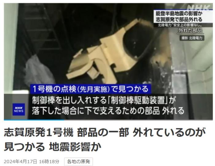 中新網(wǎng)4月19日電 據(jù)日本廣播協(xié)會(huì)(NHK)報(bào)道,日本北陸電力公司4月17日表示,位于石川縣的志賀核電站一個(gè)關(guān)鍵部件在1月1日的能登半島7.6級(jí)地震后掉落。