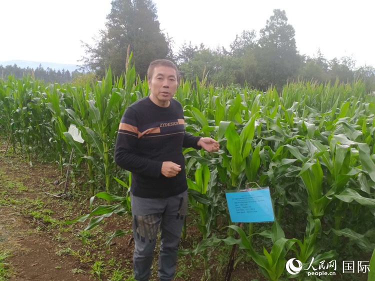 援埃農(nóng)業(yè)職教項目總負責人彭大軍向記者介紹優(yōu)質(zhì)玉米品種。人民網(wǎng)記者 黃培昭攝