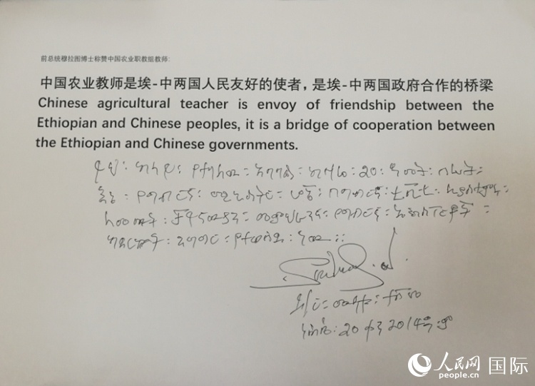 埃塞前總統(tǒng)穆拉圖對中國教師的贊揚信。人民網(wǎng)記者 黃培昭攝