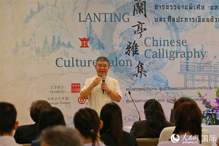 曼谷文化中心書法教師劉崇明演講。人民網(wǎng)記者 白元琪攝