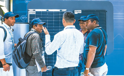 圖為參展商在第135屆廣交會上向非洲采購商介紹太陽能電池組件展品。新華社記者 劉大偉攝