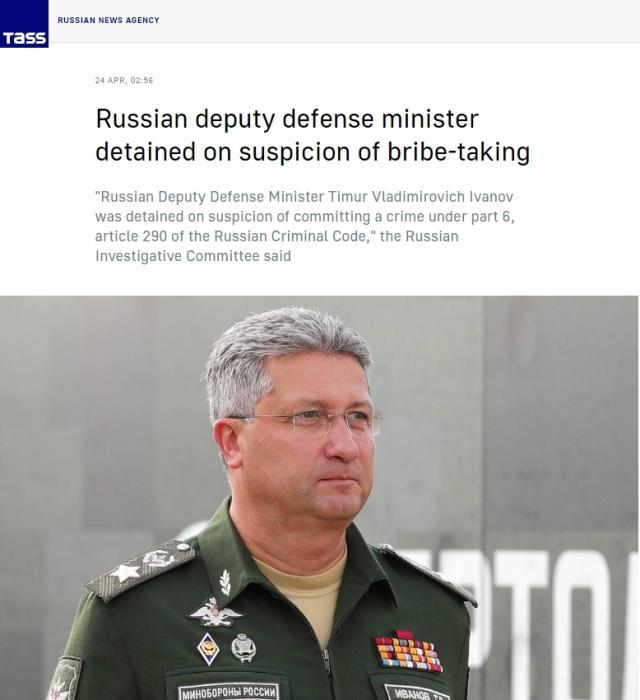 中新網(wǎng)4月24日電 據(jù)塔斯社報(bào)道,俄羅斯偵查委員會(huì)當(dāng)?shù)貢r(shí)間23日表示,俄國(guó)防部副部長(zhǎng)鐵木爾·伊萬(wàn)諾夫因涉嫌受賄被拘留。