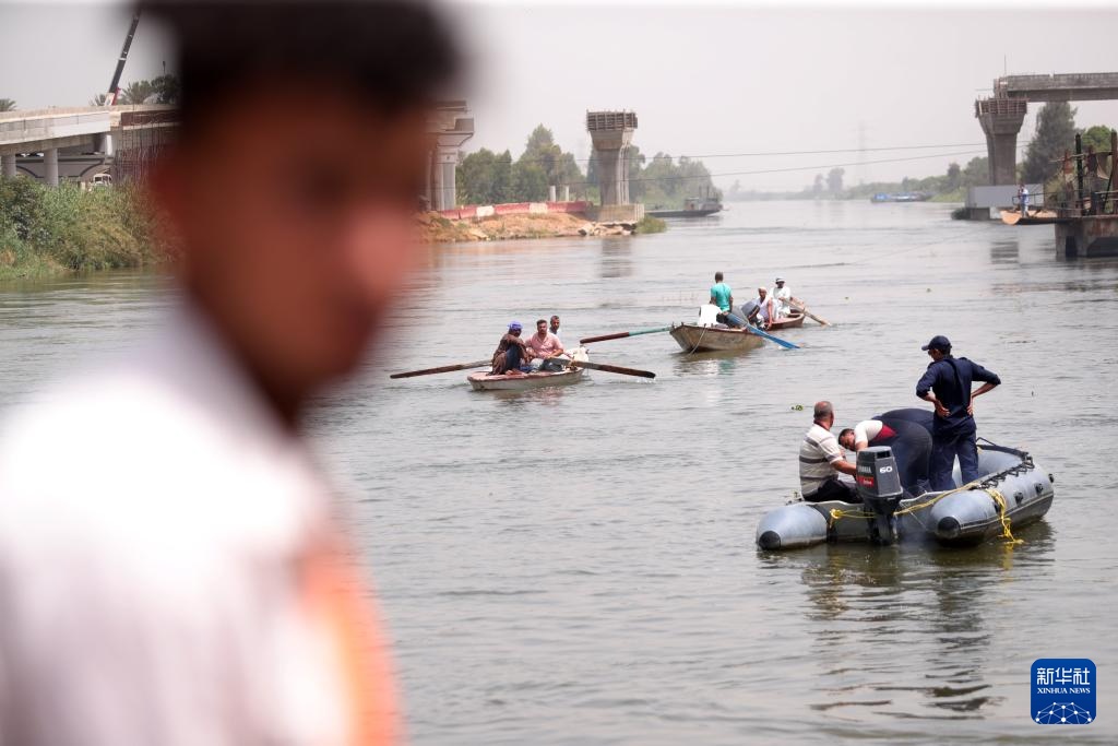 5月21日,在埃及吉薩省,救援人員在小型巴士落水事故現(xiàn)場工作。新華社發(fā)(艾哈邁德·戈馬攝)