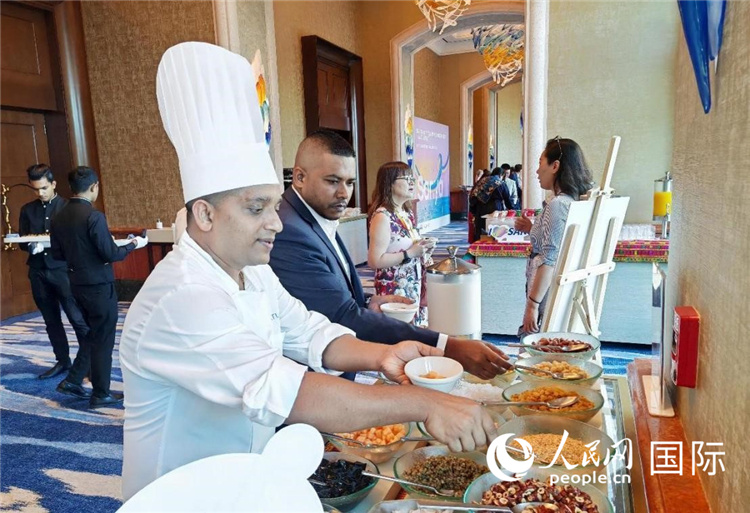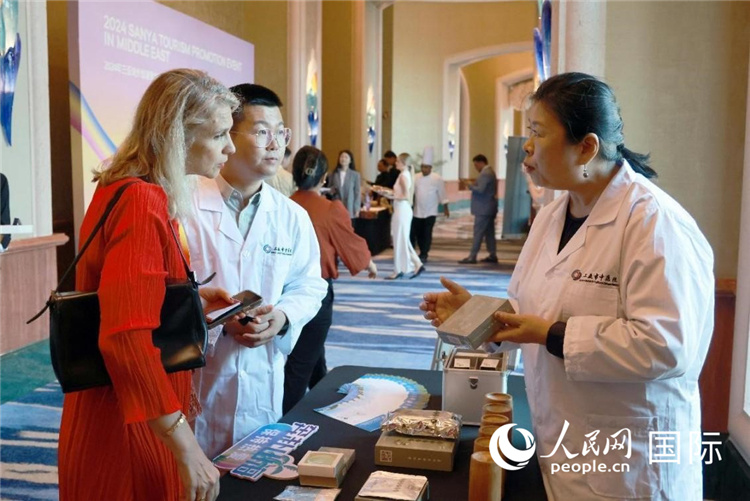 三亞市中醫(yī)院代表向來(lái)賓介紹中醫(yī)。人民網(wǎng)記者 管克江攝