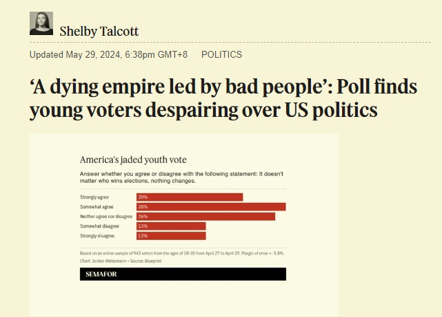 “Blueprint”的首席民調(diào)專家史密斯在評(píng)論民調(diào)時(shí)表示:“年輕選民在我們的政治制度中看不到任何好人。他們看到的是一個(gè)由壞人領(lǐng)導(dǎo)的垂死帝國?!?/p>