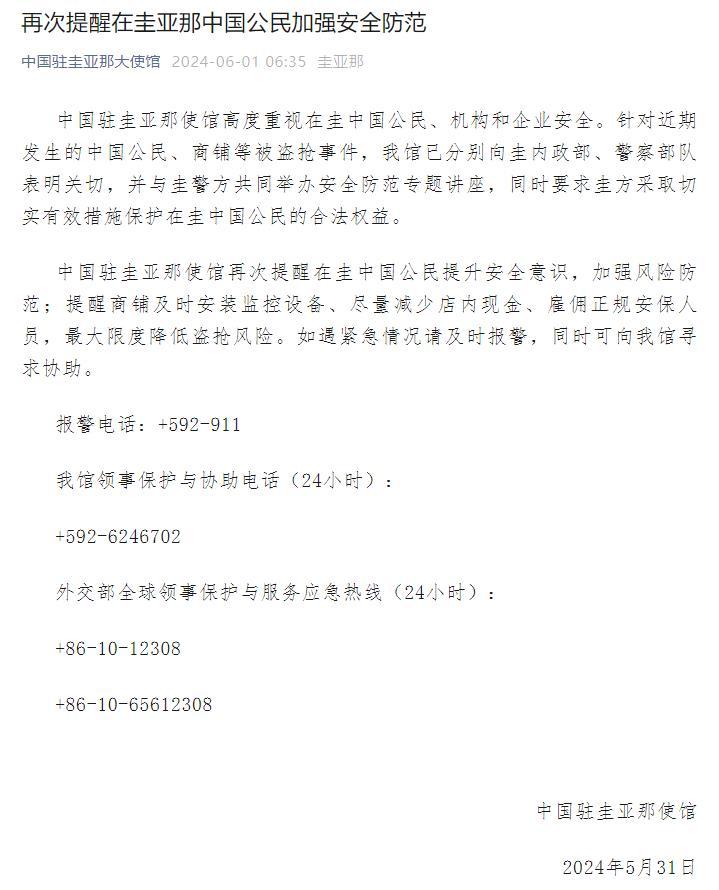 中國駐圭亞那使館再次提醒在圭中國公民提升安全意識,加強風險防范;提醒商鋪及時安裝監(jiān)控設備、盡量減少店內現(xiàn)金、雇傭正規(guī)安保人員,最大限度降低盜搶風險。如遇緊急情況請及時報警,同時可向我館尋求協(xié)助。