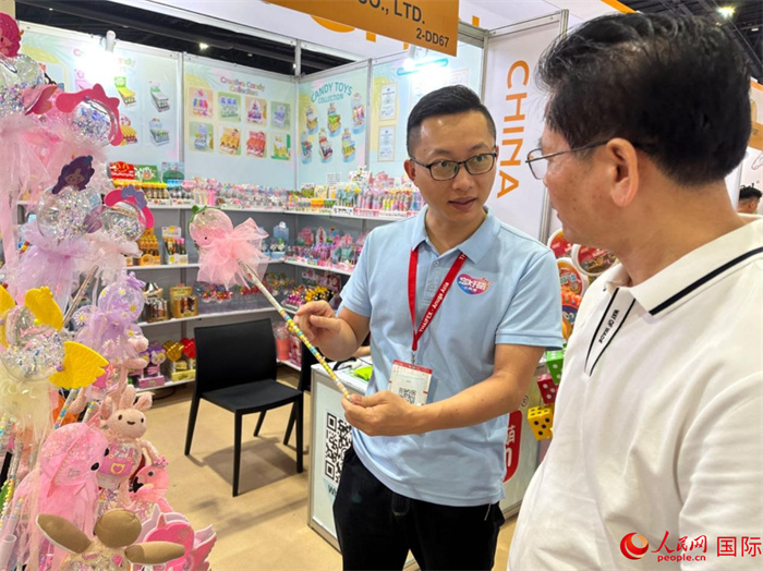 來自中國廣東的動漫食品廠商向觀眾講解食品如何和動漫結(jié)合。人民網(wǎng)記者 簡承淵攝