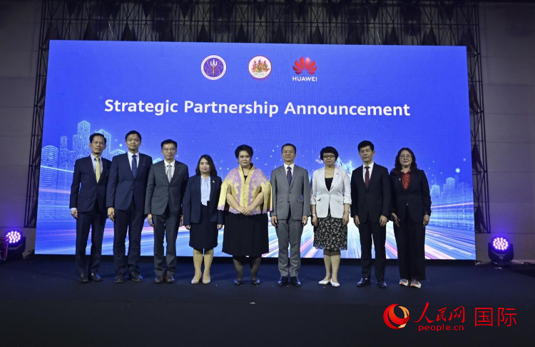 數(shù)字人才峰會現(xiàn)場。左五為泰國高等教育、科學、研究和創(chuàng)新部長素巴瑪·伊沙拉帕迪,右三中國駐泰國大使館教育參贊許蘭,右四為華為泰國技術(shù)有限公司總經(jīng)理李雄偉。人民網(wǎng)記者 簡承淵攝