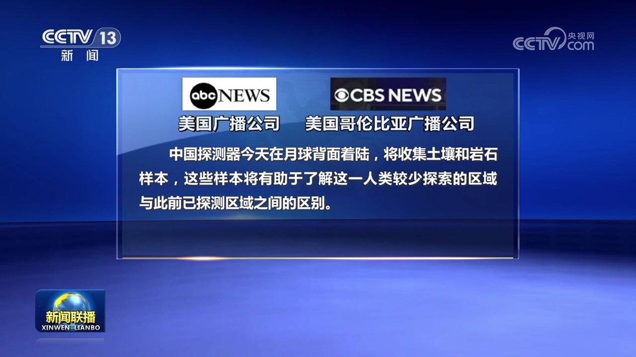 美國廣播公司、美國哥倫比亞廣播公司等美國媒體報道稱,中國探測器今天在月球背面著陸,將收集土壤和巖石樣本,這些樣本將有助于了解這一人類較少探索的區(qū)域與此前已探測區(qū)域之間的區(qū)別。