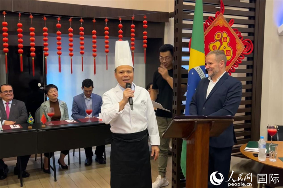 當地時間6月4日,巴西里約熱內盧州卡西亞斯公爵城舉辦廣式茶點品鑒活動,廣州市南沙區(qū)花園酒店主廚馬圖佳先生制作的南瓜餅、番薯芝士球、紫薯番石榴等近20種廣式茶點,贏得在場嘉賓的濃厚興趣和普遍贊譽。圖為馬圖佳向來賓們介紹廣式茶點的發(fā)展歷史和文化知識。 人民網記者 陳一鳴攝