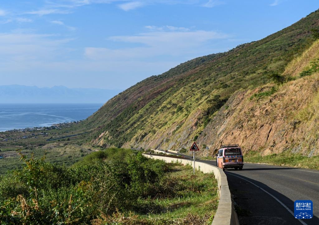 這是4月1日在烏干達(dá)西部邊境艾伯特湖畔的翠鳥(niǎo)油田項(xiàng)目所在地附近拍攝的跨崖公路。新華社記者 李亞輝 攝