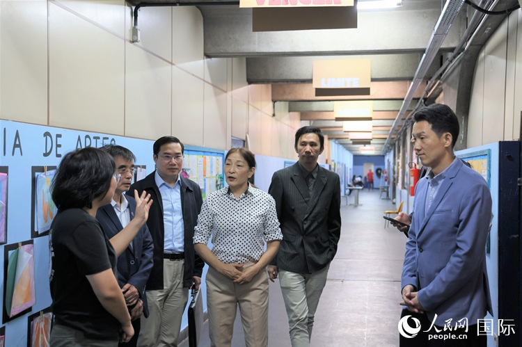 中國駐里約總領(lǐng)館商務(wù)參贊敬艷輝(右一)等嘉賓在里約孔院中方院長(zhǎng)孫艷萍(左一)帶領(lǐng)下,參觀薩繆爾·韋納公立學(xué)校的中文教室,了解該校中文教學(xué)軟硬件設(shè)施。人民網(wǎng)記者 時(shí)元皓攝