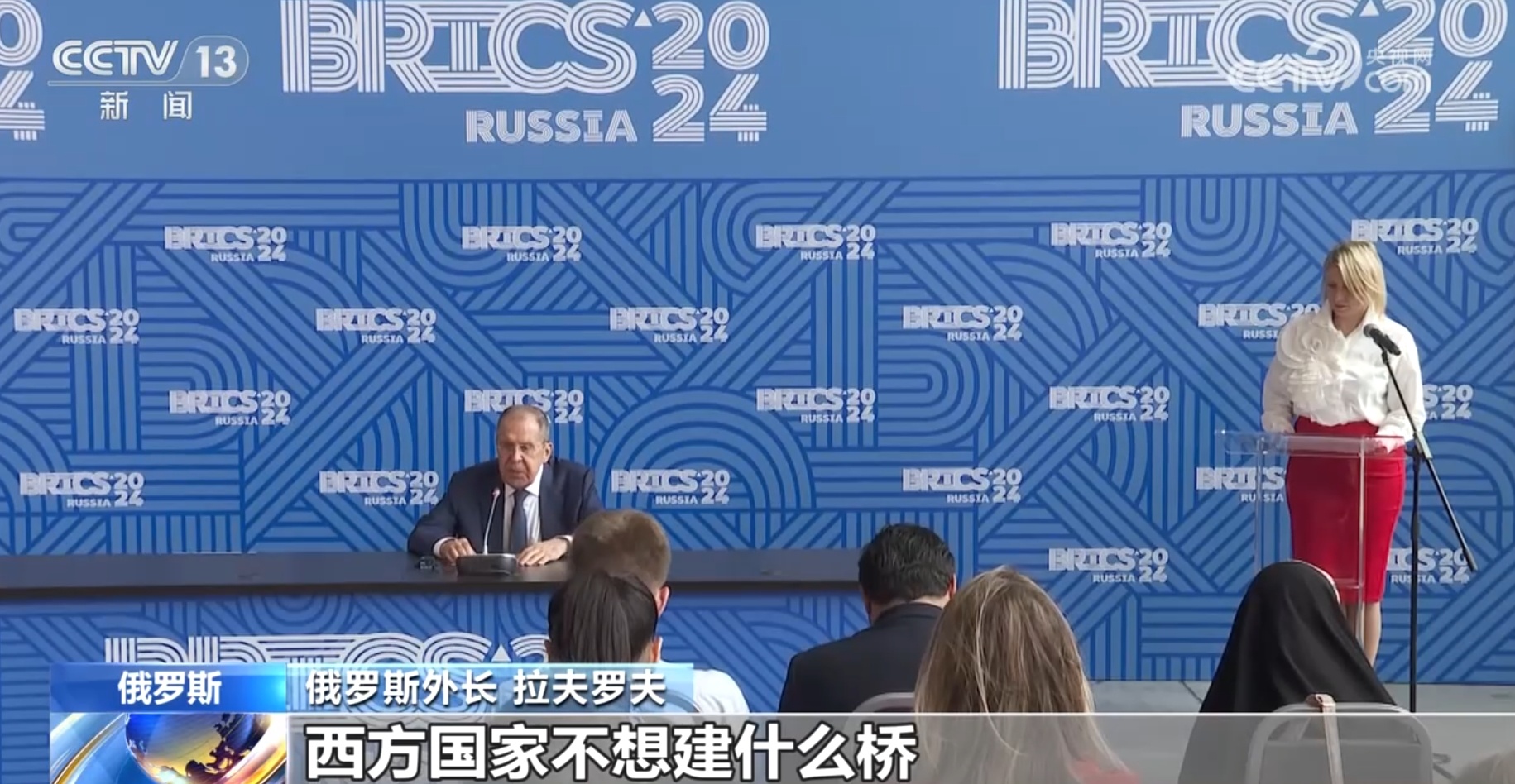 總臺記者王德祿提問稱:“在6月10日的會議上,中國外交部長王毅用中文稱金磚國家為‘大金磚’,然而我們觀察到,西方國家卻不時向全球多極化的進程拋出磚頭并建起制裁的墻,但整體而言,我們同西方國家仍存在共同利益,特別是在涉及一些全球問題的解決時。我們是不是可以建起一座橋梁,讓西方沿著它向我們走來、走向合作。謝謝?!?/p>