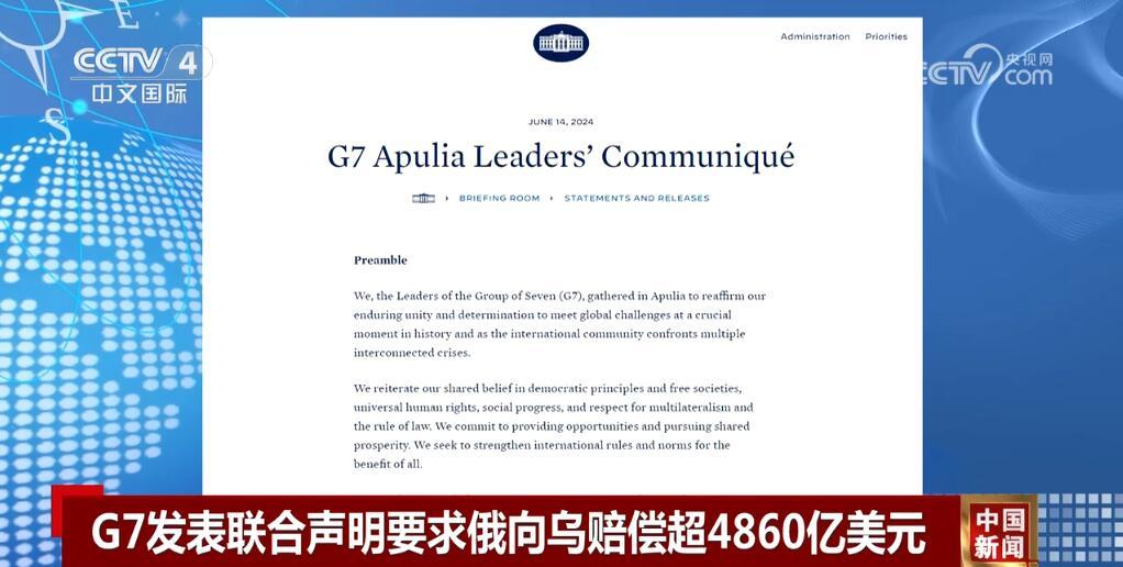 央視網消息:七國集團峰會6月13日至15日在意大利南部舉行。據(jù)“今日俄羅斯”電視臺等多家媒體報道,G7領導人14日發(fā)表聯(lián)合聲明,重申支持烏克蘭,并要求俄羅斯向烏克蘭賠償超過4860億美元的損失。