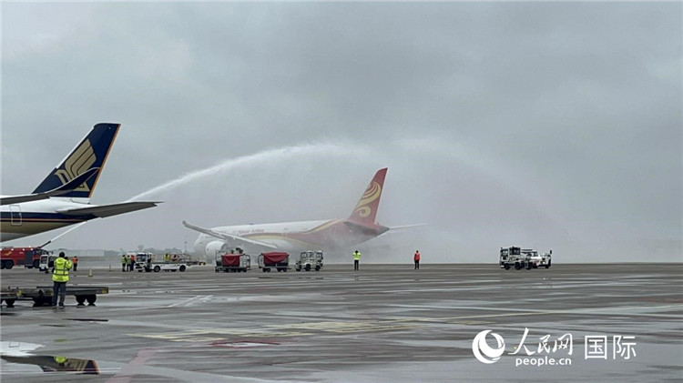 航班享受“水門禮”后起飛。人民網記者 牛瑞飛攝