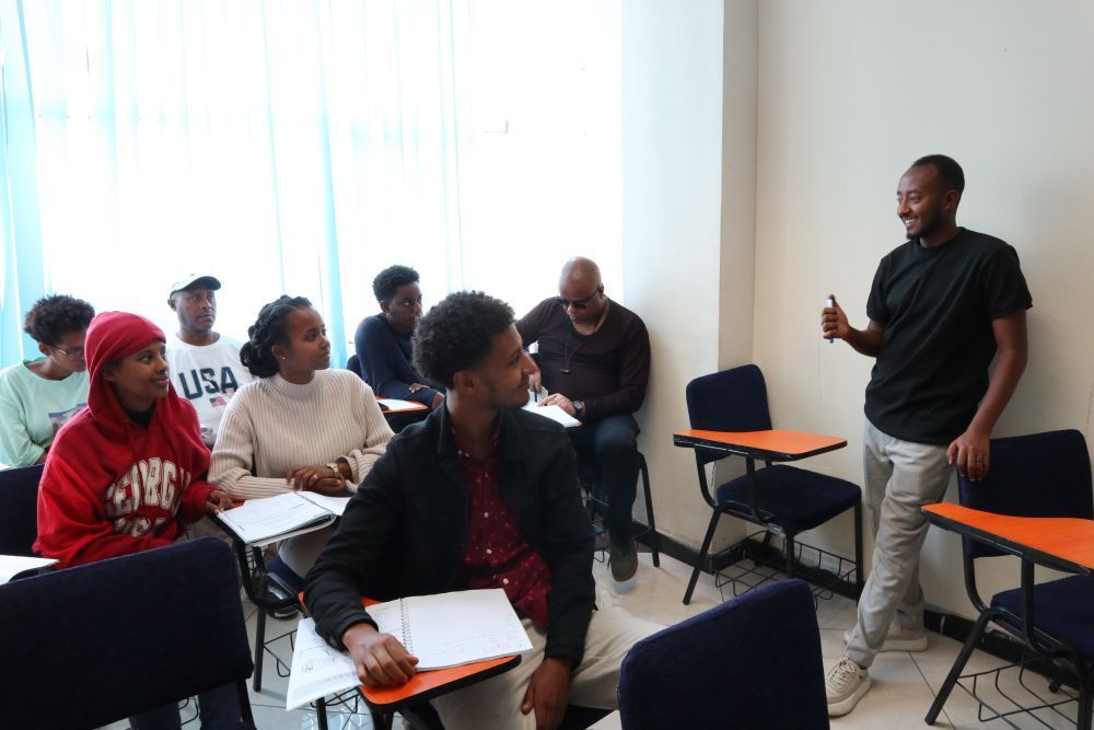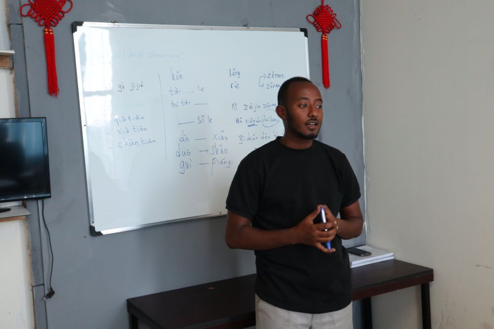 27歲的卡利布·澤拉萊姆是這里的中文教師。2017年至2021年,他曾在中國的湖北師范大學(xué)留學(xué),掌握了一口流利的中文。學(xué)成歸來后,他發(fā)現(xiàn)埃塞有不少中國企業(yè),兩國各領(lǐng)域交流熱絡(luò),埃塞民眾中文學(xué)習(xí)需求旺盛,于是創(chuàng)辦了中文培訓(xùn)機(jī)構(gòu)——你好Habesha。在當(dāng)?shù)卣Z言中,“Habesha”意為“埃塞俄比亞人”。