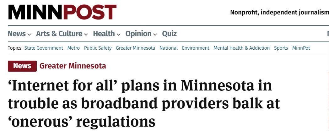 另據(jù)《明尼蘇達郵報》(MinnPost)25日報道,當(dāng)明尼蘇達電信聯(lián)盟(Minnesota Telecom Alliance)總裁兼首席執(zhí)行官布倫特·克里斯滕森(Brent Christensen)被問到有多少會員將參與BEAD計劃時,他迅速做出了“零”的回答??死锼闺f,由于附帶的規(guī)章制度,他們都不會競標(biāo)聯(lián)邦補助金。該州的有線電視公司也對這項計劃的新舉措感到不滿。明尼蘇達州有線通信協(xié)會梅麗莎·沃爾夫(Melissa Wolf)認(rèn)為,“提供低成本選擇對于小型供應(yīng)商來說是行不通的”。