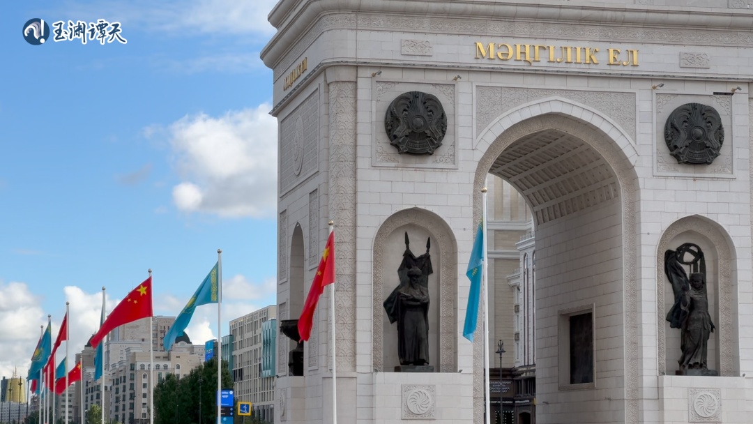 ||譚主抵達阿斯塔納,象征著哈薩克斯坦歷史的“凱旋門”周圍飄揚著歡迎旗幟