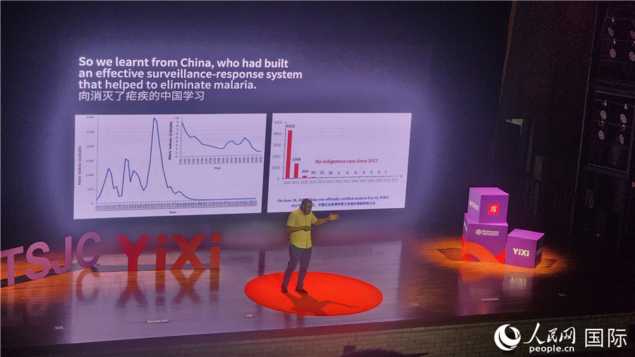 | 坦桑尼亞瘧疾防控專家姆拉查介紹坦中兩國(guó)在瘧疾防治領(lǐng)域的合作。人民網(wǎng)記者 萬(wàn)宇攝 |