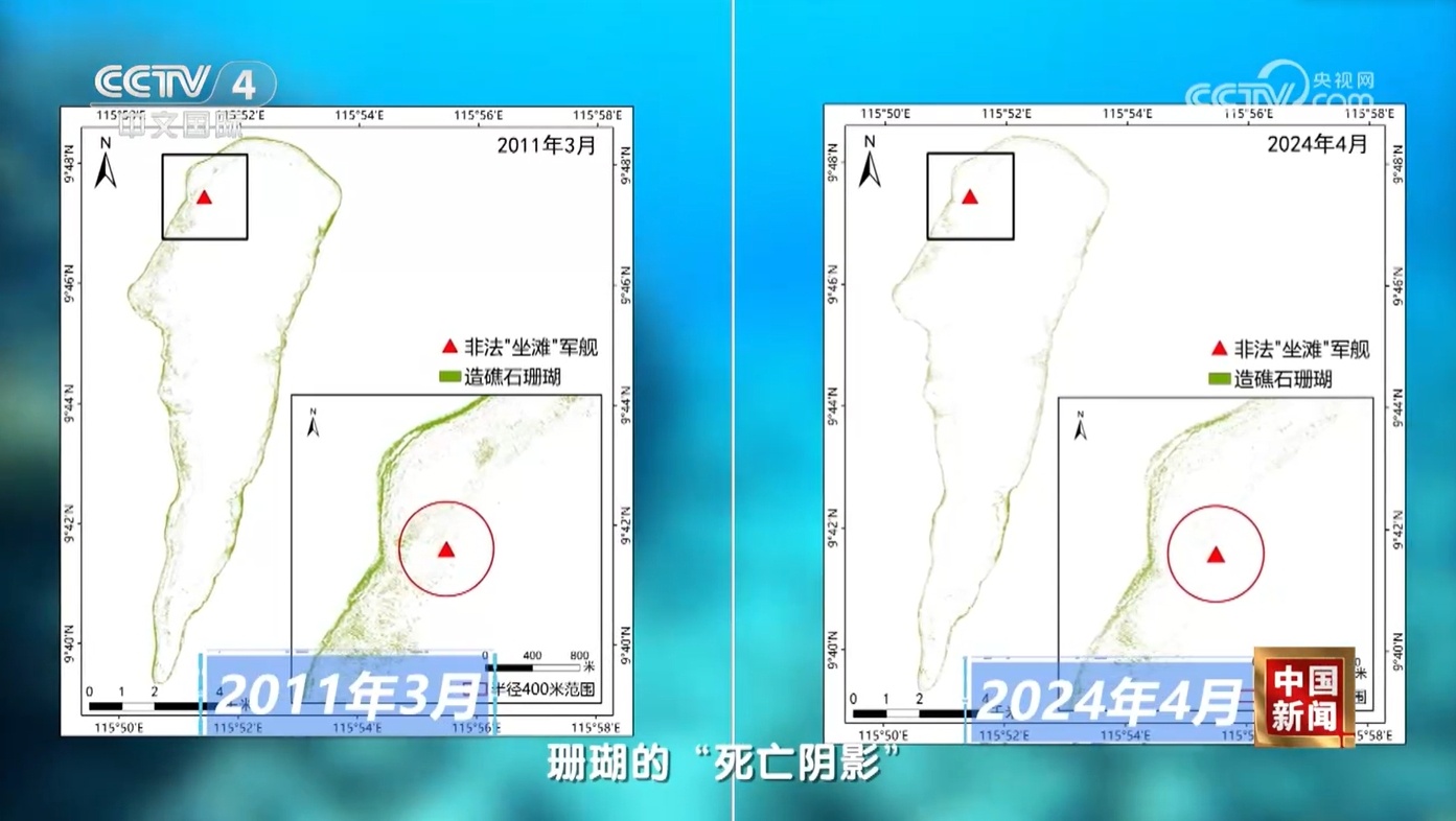 1999年以來,菲律賓軍艦在仁愛礁非法“坐灘”,嚴(yán)重侵犯中國領(lǐng)土主權(quán)和海洋權(quán)益。有關(guān)科學(xué)調(diào)查報(bào)告顯示,該軍艦在“坐灘”過程中毀滅性破壞珊瑚礁,船體銹蝕破損析出重金屬抑制珊瑚生長,艦上人員生活和菲方人員捕撈等還對仁愛礁珊瑚礁生態(tài)系統(tǒng)造成持續(xù)損害。