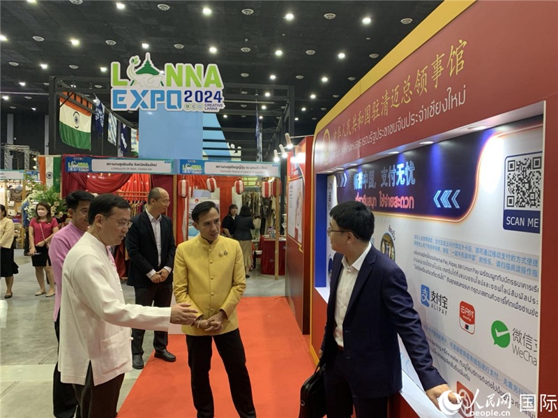 7月9日,中國(guó)駐清邁總領(lǐng)事陳海平與清邁副府尹威拉蓬等共同參觀以“暢游中國(guó)、支付無憂”為主題的中國(guó)展位。人民網(wǎng)記者 章念生攝